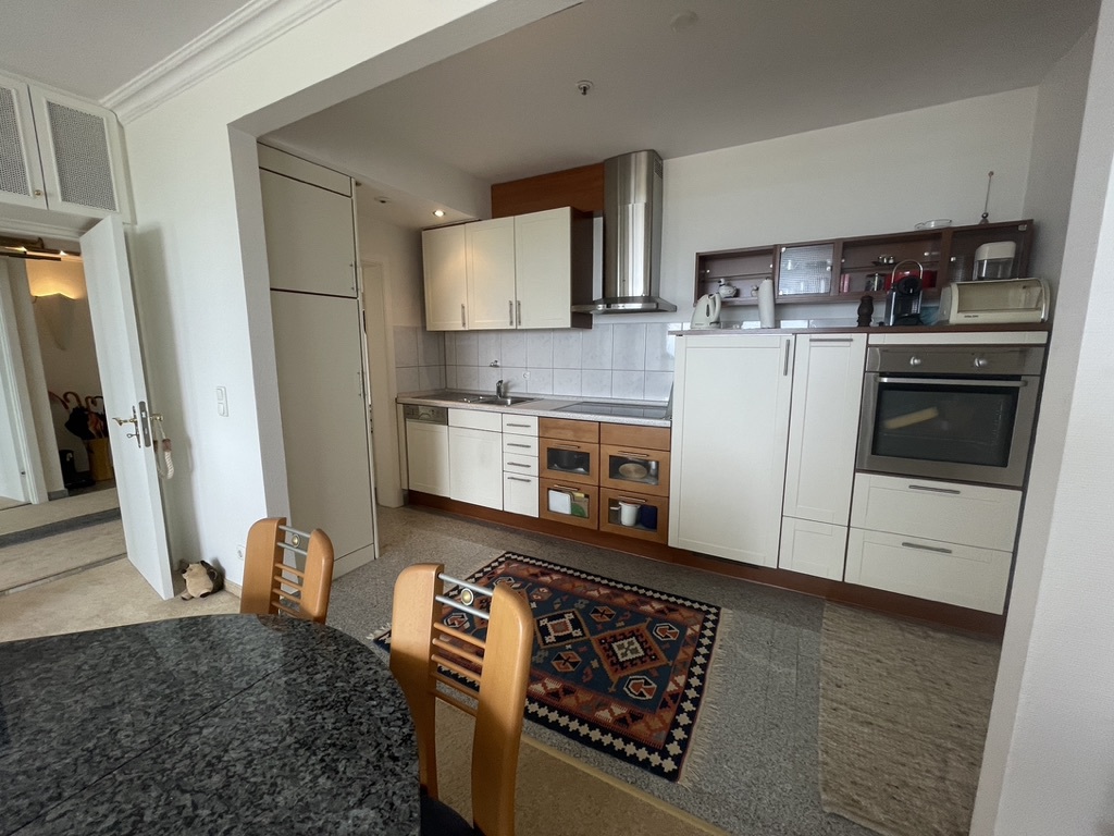 Offene Küche: komplett eingerichtete Küche mit Spülmaschine, 4er Cerankochfeld, Mikrowelle, Backofen, Dunstabzug, Kühlschrank mit Gefrierfach, Toaster, Kaffeemaschine