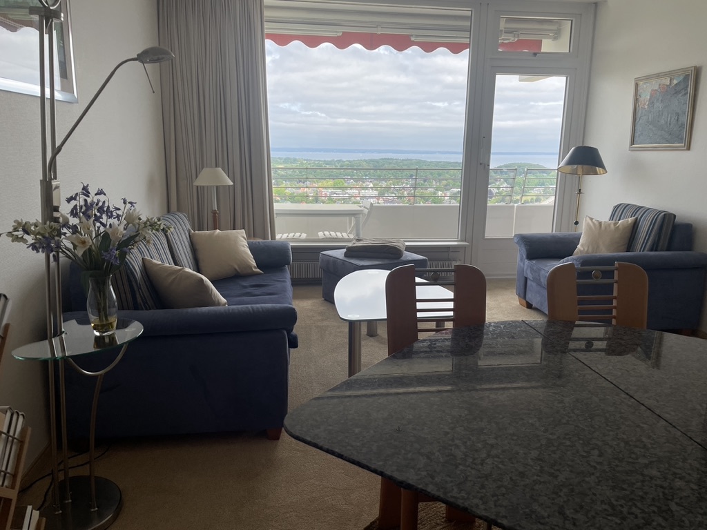 Wohn- und Esszimmer: Couch mit Hocker und Sessel, TV-Schrankwand mit Flat TV (Kabelanschluß),