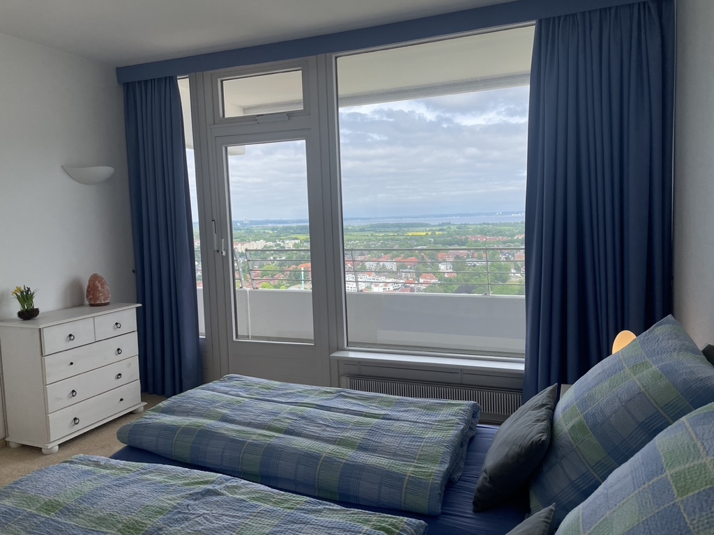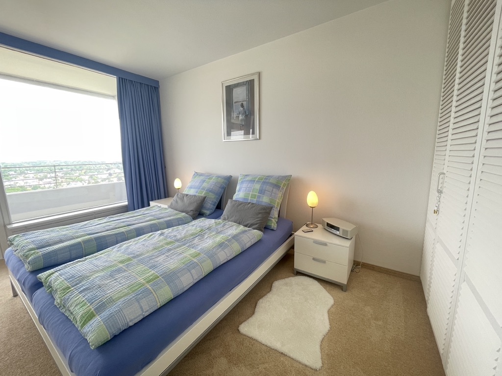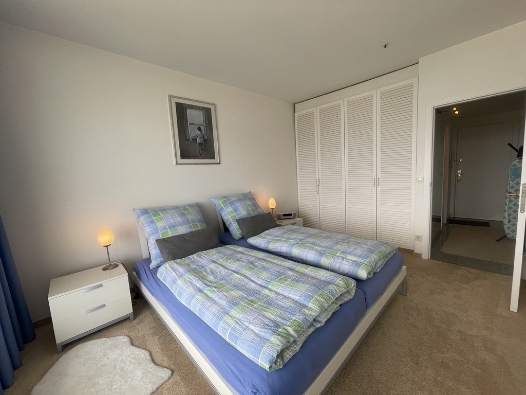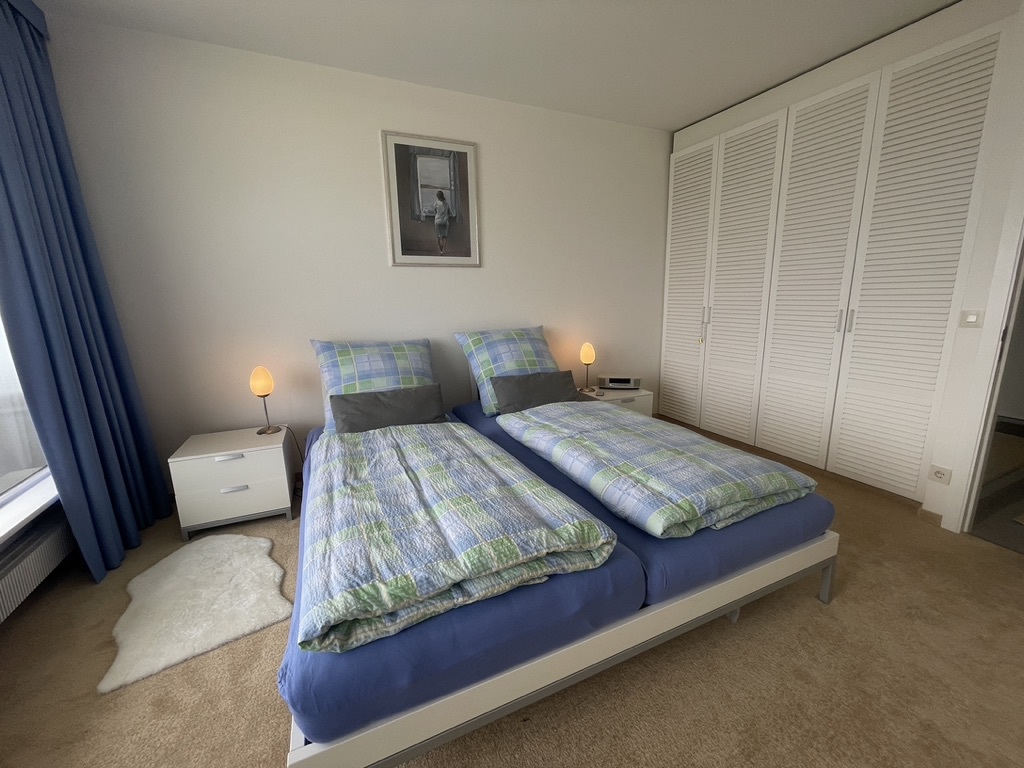 Schlafzimmer: Doppelbett mit verstellbaren Lattenrosten, Einbaukleiderschrank, eigener Zugang zum Balkon, Gartenmöbel.