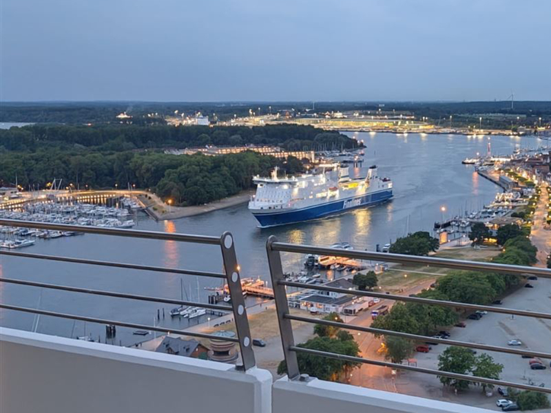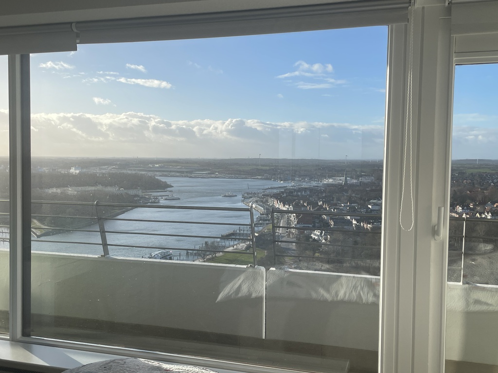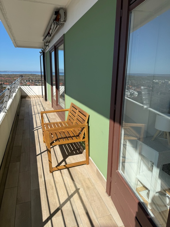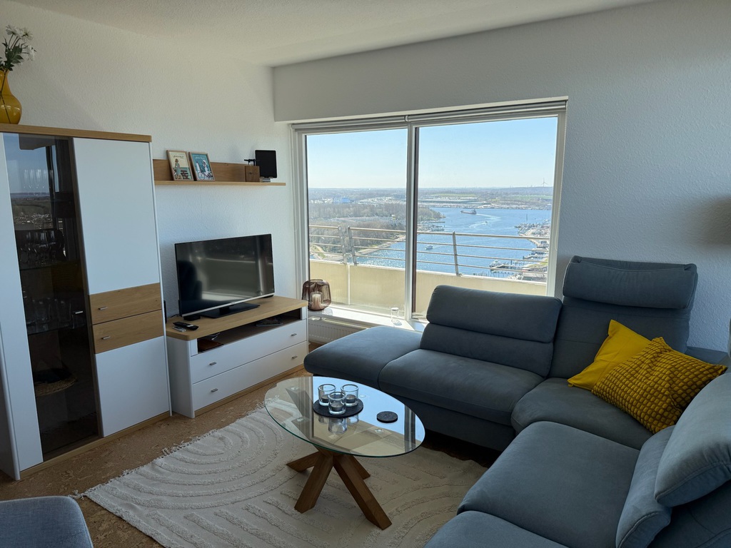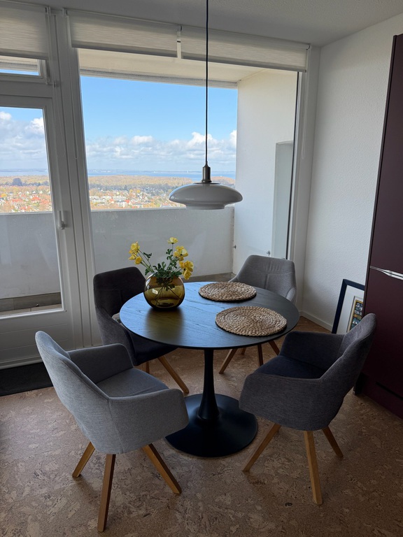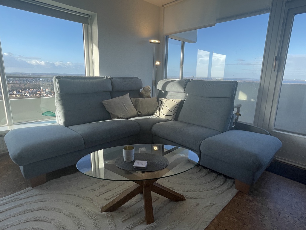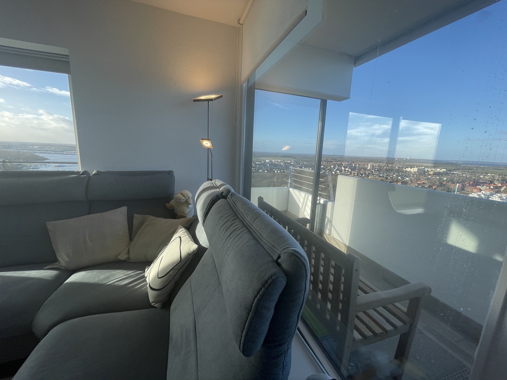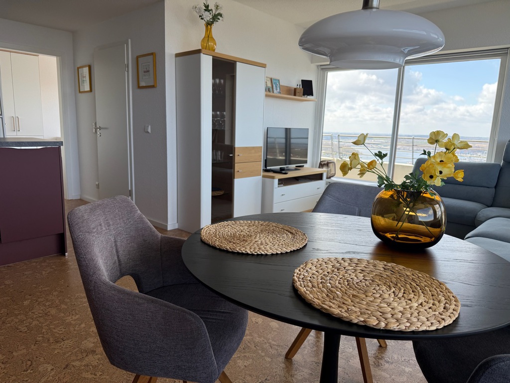 Wohn- und Esszimmer: bequemes Ecksofa, Esstisch mit 4 Stühlen, Schränken, Flat TV (Kabelanschluß), Gartenmöbel, eigener Zugang zum umlaufenden Balkon mit Glasschiebetür, Markisen