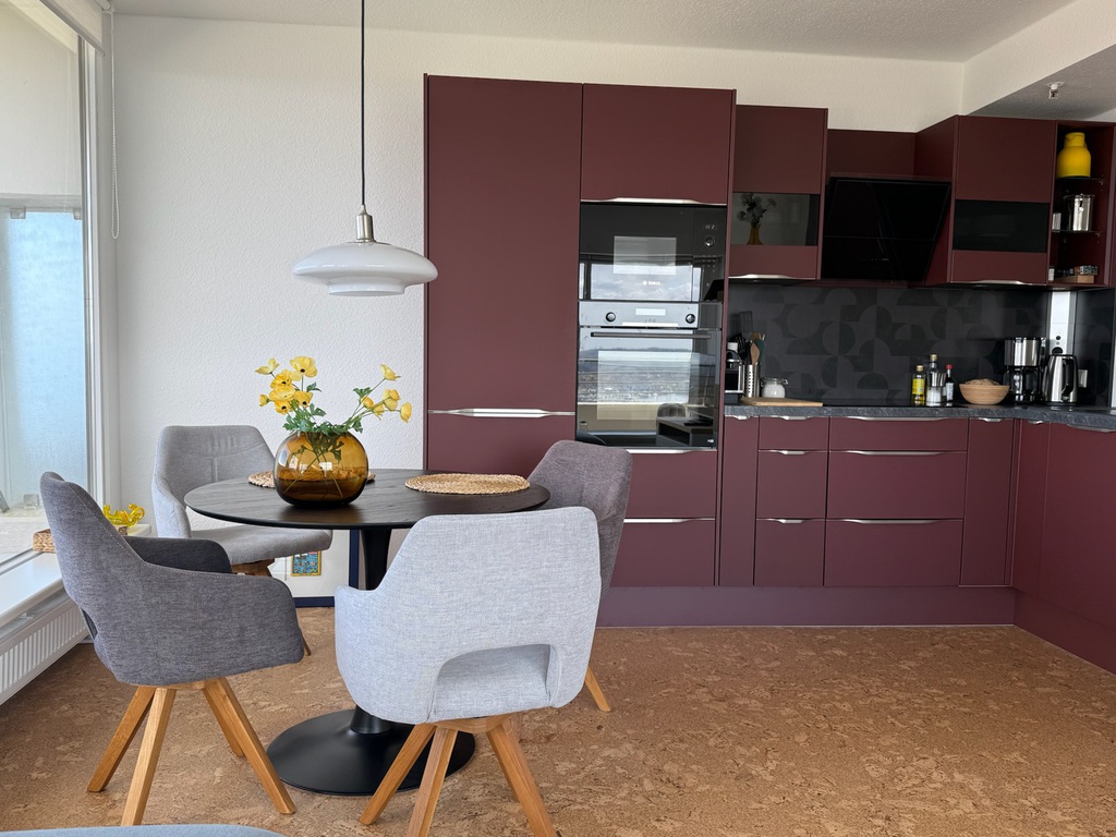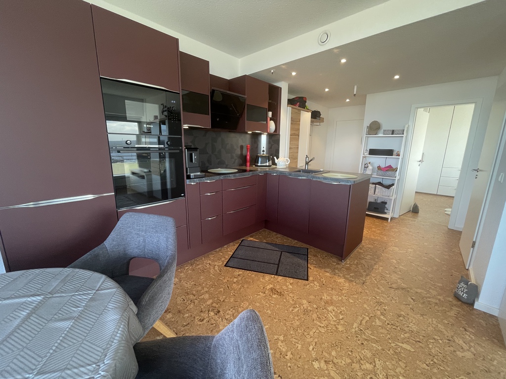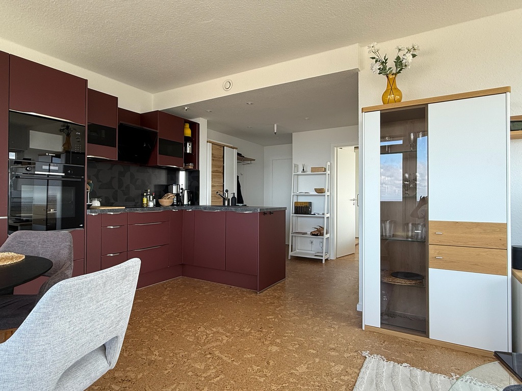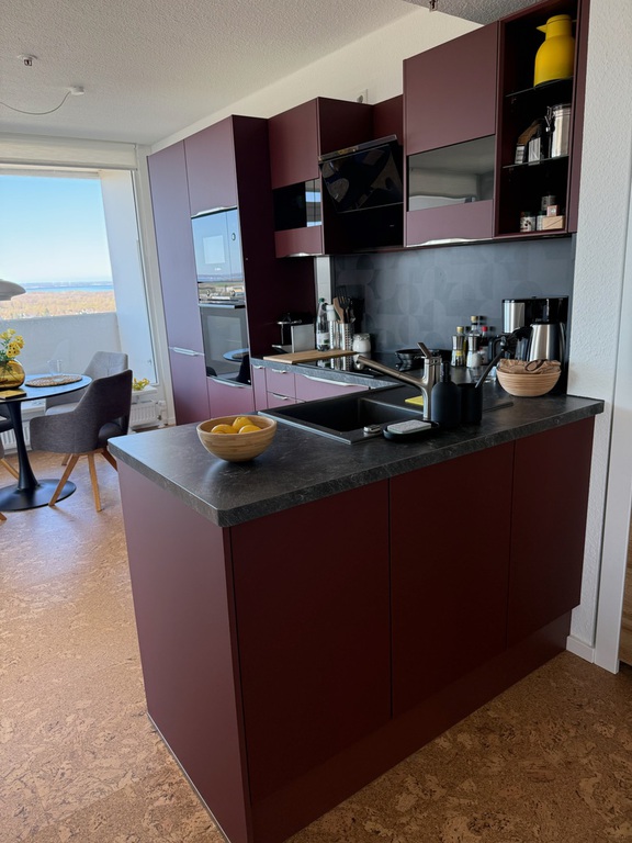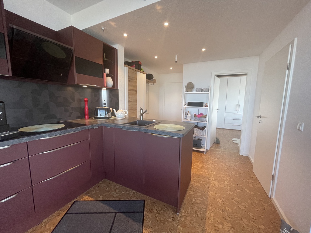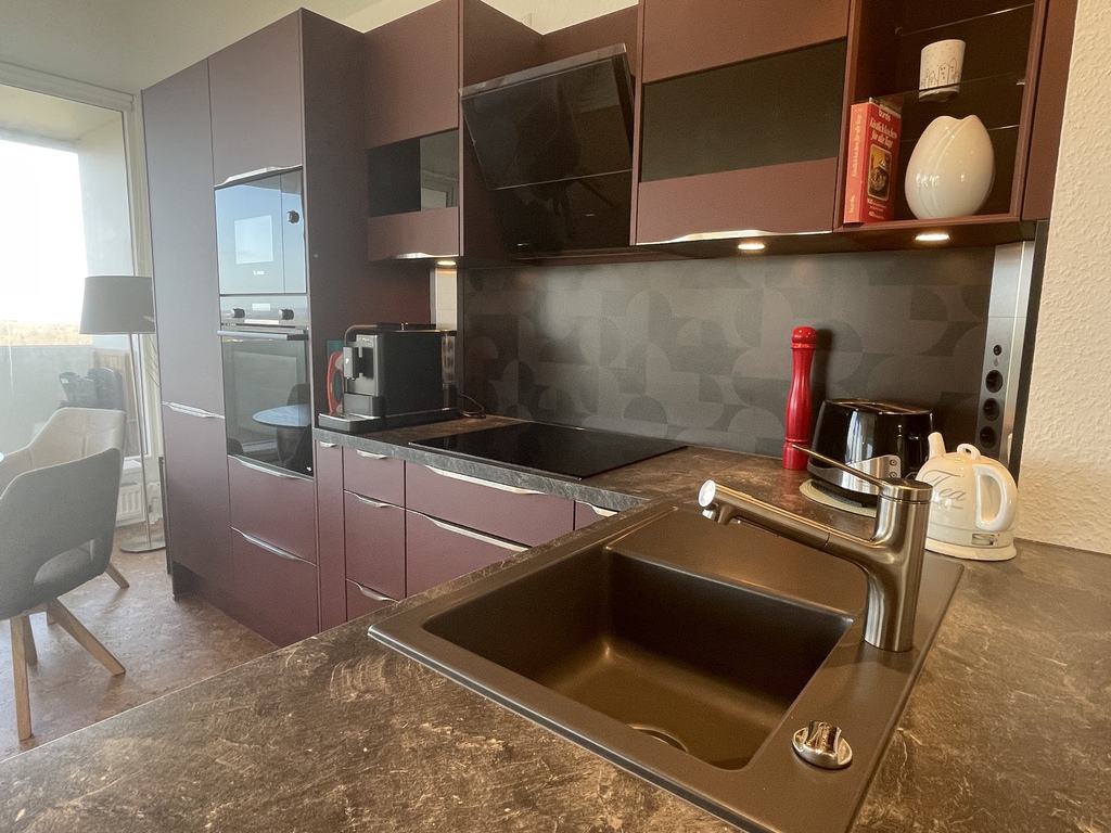 Küche: offene, hochwertig eingerichtete Einbauküche mit Spülmaschine, 4er Induktionskochfeld mit Dunstabzug, Backofen, Mikrowelle, Kühl-Gefrierkombischrank, Kaffeemaschine, Toaster und