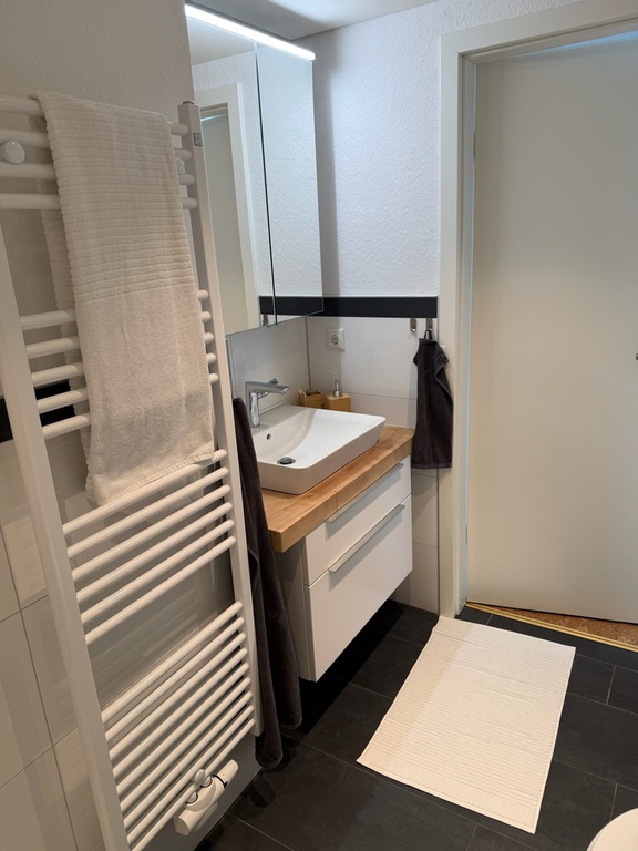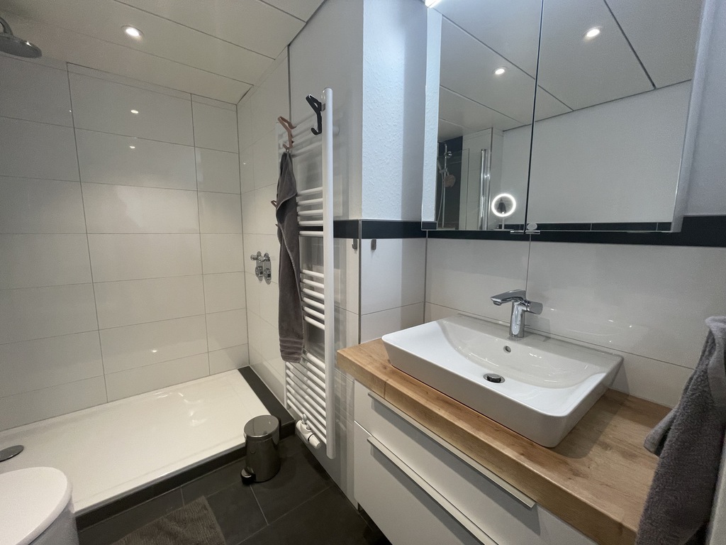 Bad: hochwertiges Duschbad mit WC, niedrigem Duscheinstieg, Waschtisch mit Badmöbeln und Heizkörper
