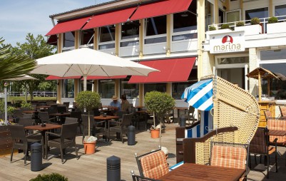 Die besondere Lage macht das Restaurant einzigartig: Während des Essens (draußen oder drinnen) ziehen die großen Pötte und